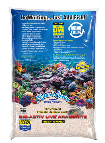 • Nature’s Ocean® Bio-Activ Live™ Aragonite is guaranteed to contain more than 10 million live bacteria per pound of sand in a natural biofilm, ready to instantly start the cycling process and stabilize your tank.